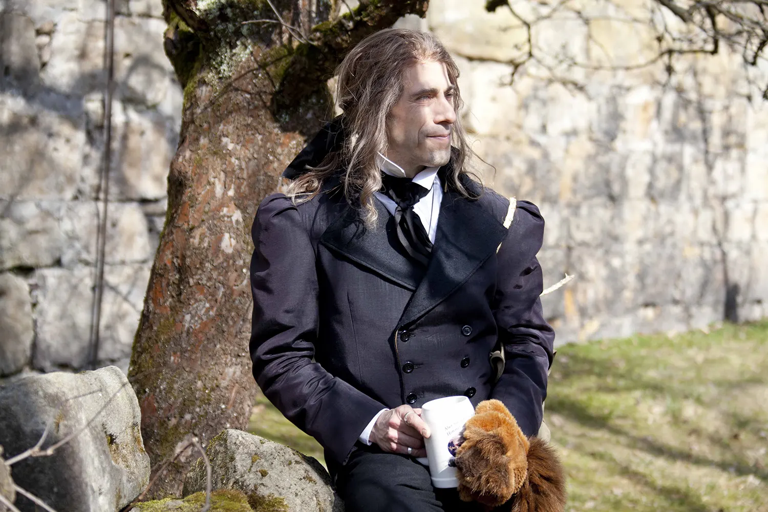 Schauspieler Peter Kampschulte nimmt 2011 beim Jean Paul-Weg Arkadienfest in Bayreuth (hier im Schwabacher Garten) bewusst die Pose von diesem allgemein bekannten Jean Paul-Stich ein.