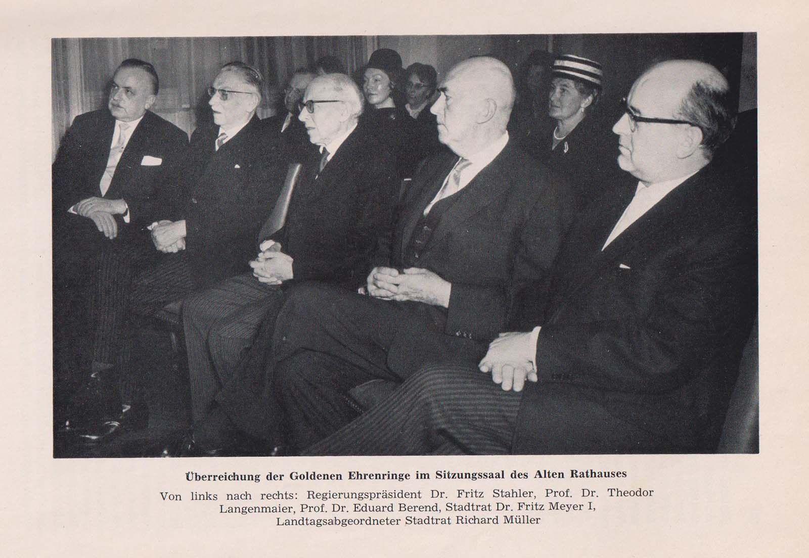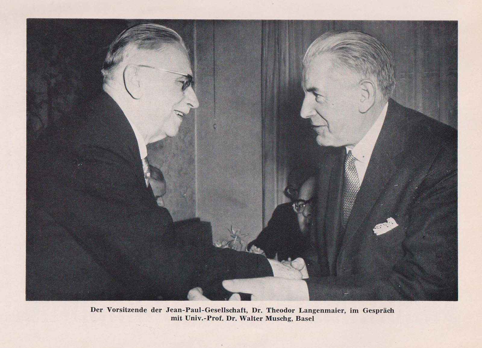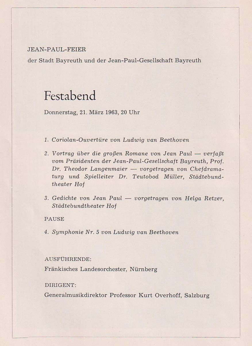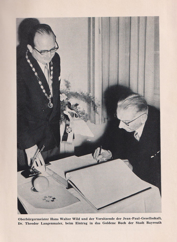 Der bedeutende Jean-Paul-Forscher Eduard Berend, der als Jude während der Nazizeit aus der Jean-Paul-Gesellschaft ausgeschlossen worden war und emigrieren musste, erhält den Goldenen Ehrenring der Stadt Bayreuth. Mit ihm wird auch der Präsident der Jean-Paul-Gesellschaft Theodor Langenmaier ausgezeichnet, der für den großen Festabend am selben Tag einen Vortrag über die großen Romane bzw. Werke Jean Pauls verfasst: Unsichtbare Loge, Hesperus, Siebenkäs, Titan, Flegeljahre, Levana und Komet.