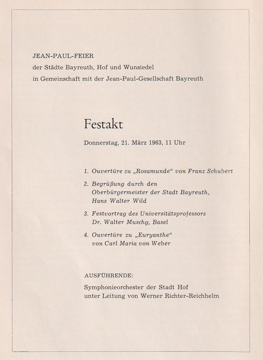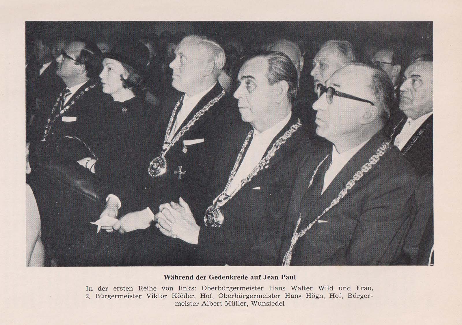 Die Städte Bayreuth, Hof und Wunsiedel veranstalten in Gemeinschaft mit der Jean-Paul-Gesellschaft Bayreuth einen Festakt im Evangelischen Gemeindehaus. Oberbürgermeister Hans-Walter Wild begrüßt die Gäste, Walter Muschg (Basel) hält den Festvortrag und das Symphonieorchester der Stadt Hof spielt Ouvertüren von Franz Schubert und Carl Maria von Weber.