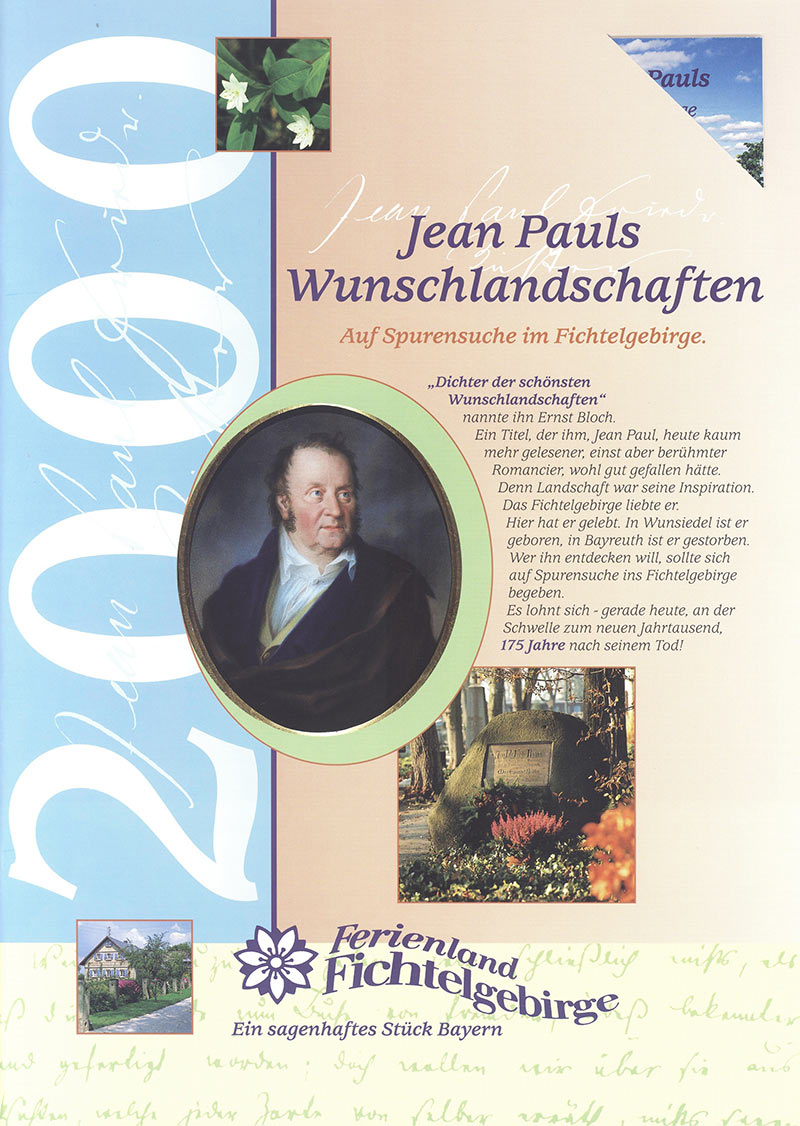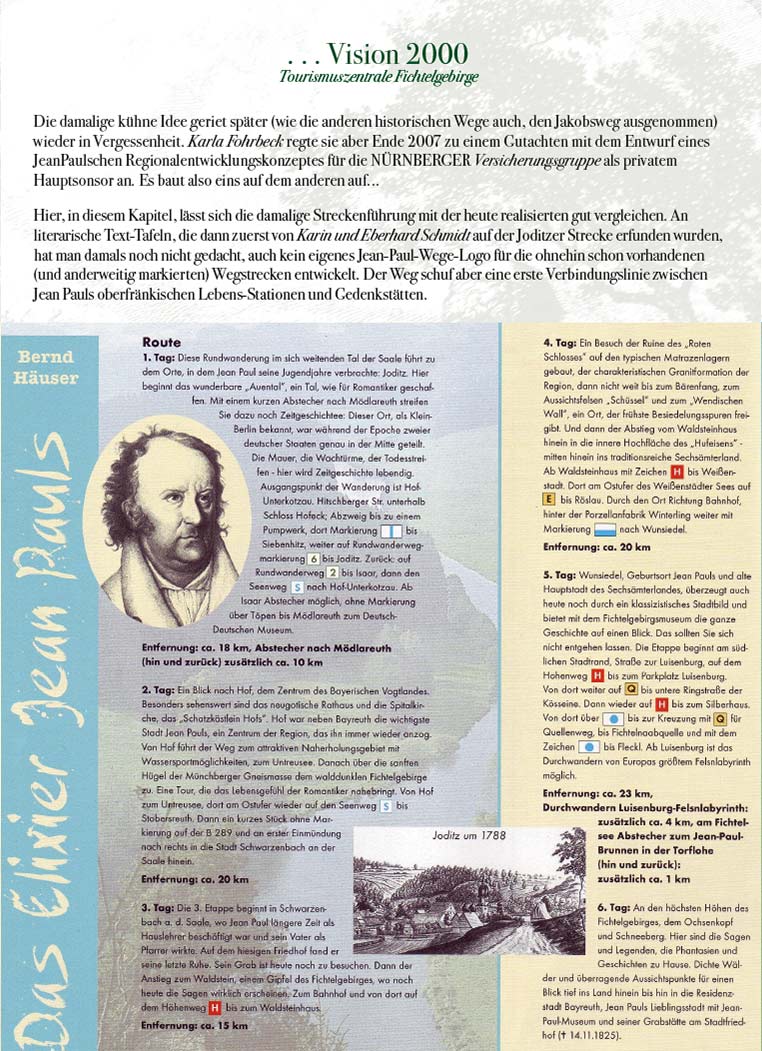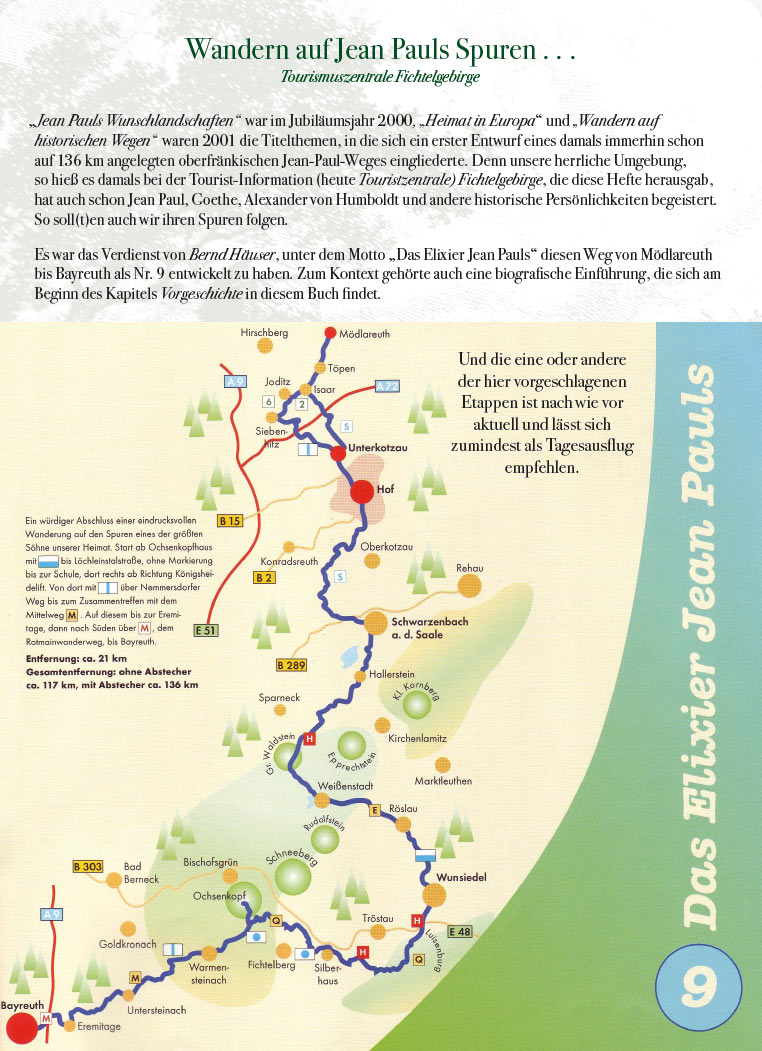 . . .eines solchen Jean-Paul-Wegs, den Bernd Häuser und die Tourismuszentrale Fichtelgebirge (noch ohne Texttafeln) im Anschluss an das Jubiläumsjahr 2000 (175. Todesjahr des Dichters) unter dem Motto „Wandern auf historischen Wegen“ herausbrachte und der vom ehemaligen nördlichen Grenzort Mödlareuth bis Bayreuth führen sollte, geriet schnell in Vergessenheit – wie andere nach großen Geistern benannte, aber nicht von diesen belebte Wegpläne auch (Goethe, Humboldt usw.).
