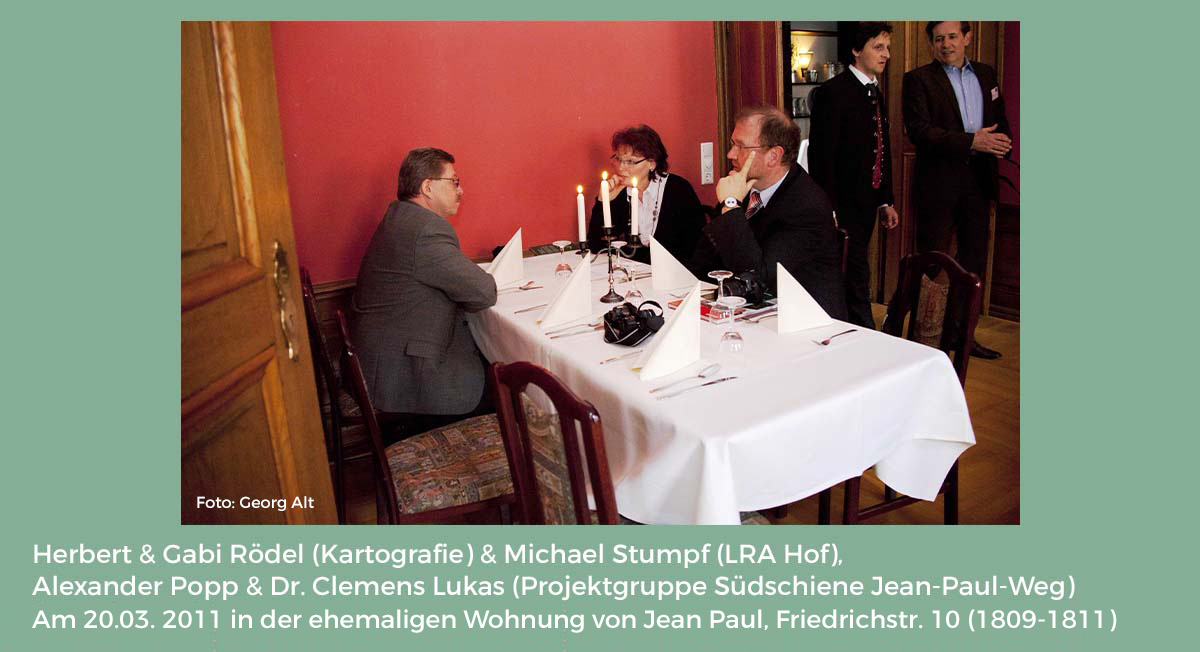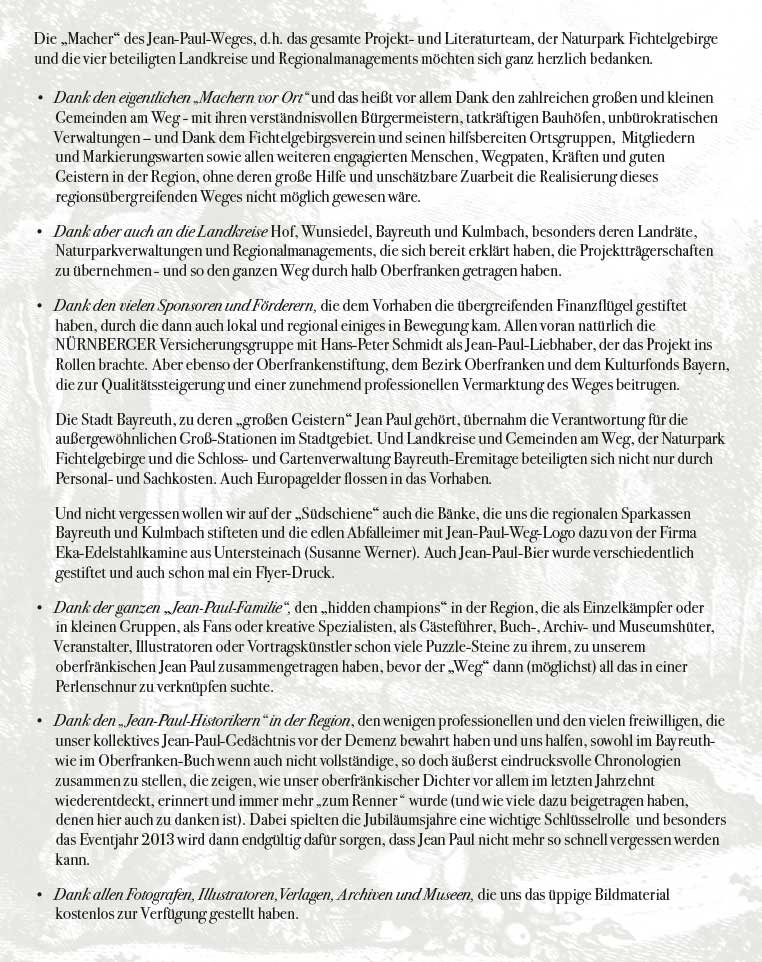 Dr. Clemens Lukas, Chef der Agentur KulturPartner in Bayreuth, dem Karla Fohrbeck Ende 2007 ihre Idee eines Jean-Paul-Literatur-Weges von Joditz bis Sanspareil als größeres und längerfristiges Entwicklungsprojekt vorlegte, war damals sofort davon angetan. Und ein spontaner winterlicher Ausflugstag zu den wichtigsten Jean-Paul-Orten an dieser Strecke überzeugte beide von dem großen Wurf, der gelingen würde, wenn…
