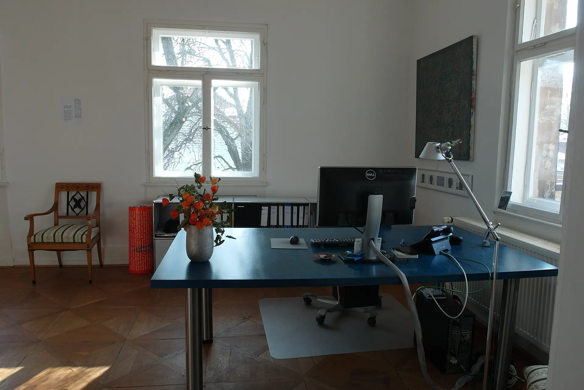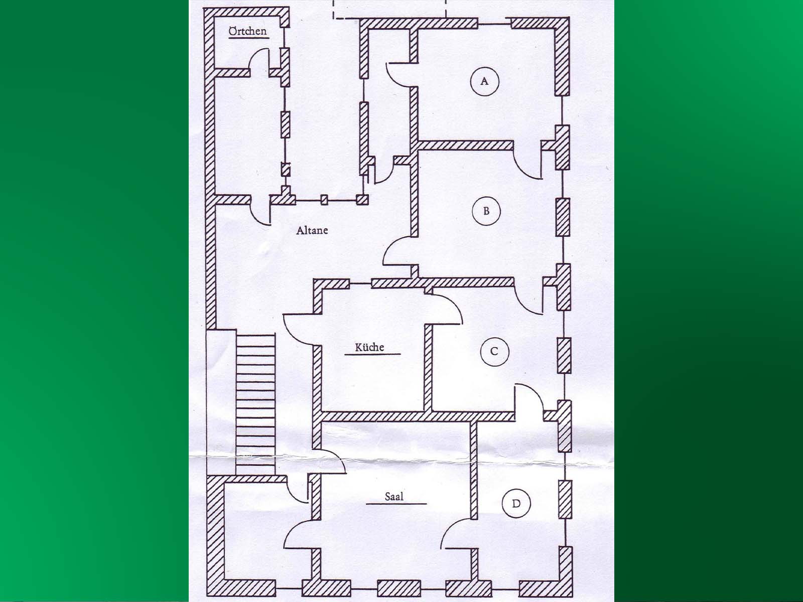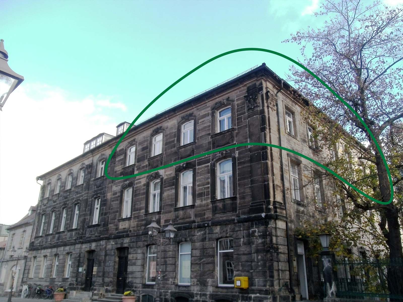 Dann im Februar 2014, als das Weg-Projekt und das offizielle Jean Paul-Jubiläumsjahr 2013 beendet waren, der überraschende Umzug in Jean Pauls einstige – jetzt frisch renovierte – großbürgerliche Wohnung, in die Friedrichstraße 3, 2. Stock oben rechts. Wo einst die 5köpfige Familie des Dichters (1811-1825) mit Dienstpersonal wohnte, durften wir jetzt arbeiten – mit großem Saal mit Blick auf die Friedrichstraße, Küche, Jean Paul-Archiv im einstigen Töchterzimmer links unten, Arbeitszimmer von Clemens Lukas (D) und 3 weiteren wunderbar großzügigen Arbeitszimmern mit Blick zum Garten (A-C).