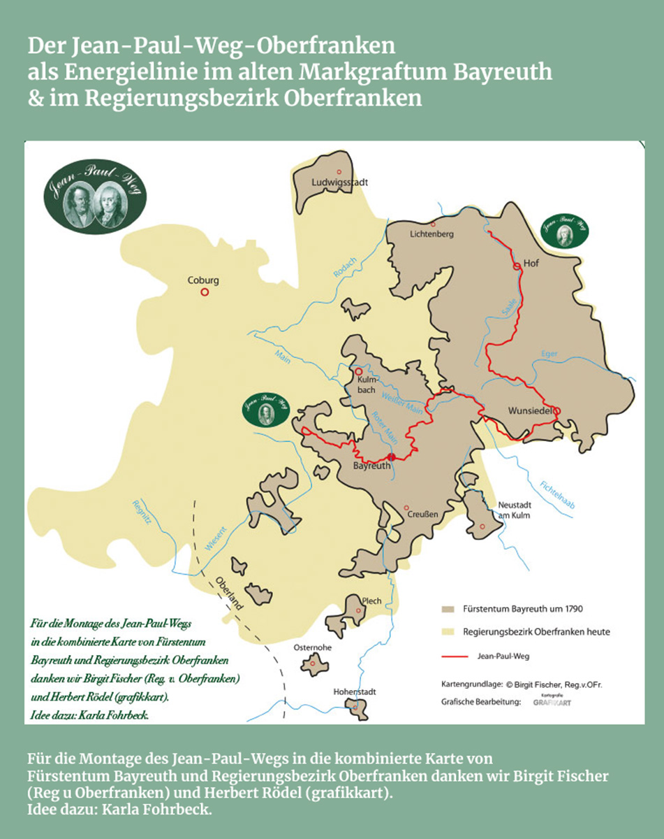 Der Jean-Paul-Weg repräsentiert gleichsam die geheime Lebensader des alten Markgraftums Bayreuth-Brandenburg, unter dessen Verarmung der Dichter vor allem in seiner Jugend litt, dessen arkadische Parks, Landschaften und Architekturen er aber auch genoss, bewunderte und liebte.