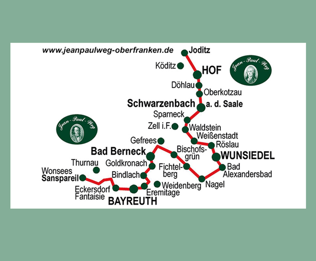Die biografische Linie von „Jean Pauls Orten“ in Oberfranken verbindet die 4 Landkreise Hof, WunsiedeL, Bayreuth und Kulmbach samt 22 Städten und Gemeinden am Weg und wird damit – so die Vision – zum geistigen und vielleicht auch touristischen Rückgrat der Region.