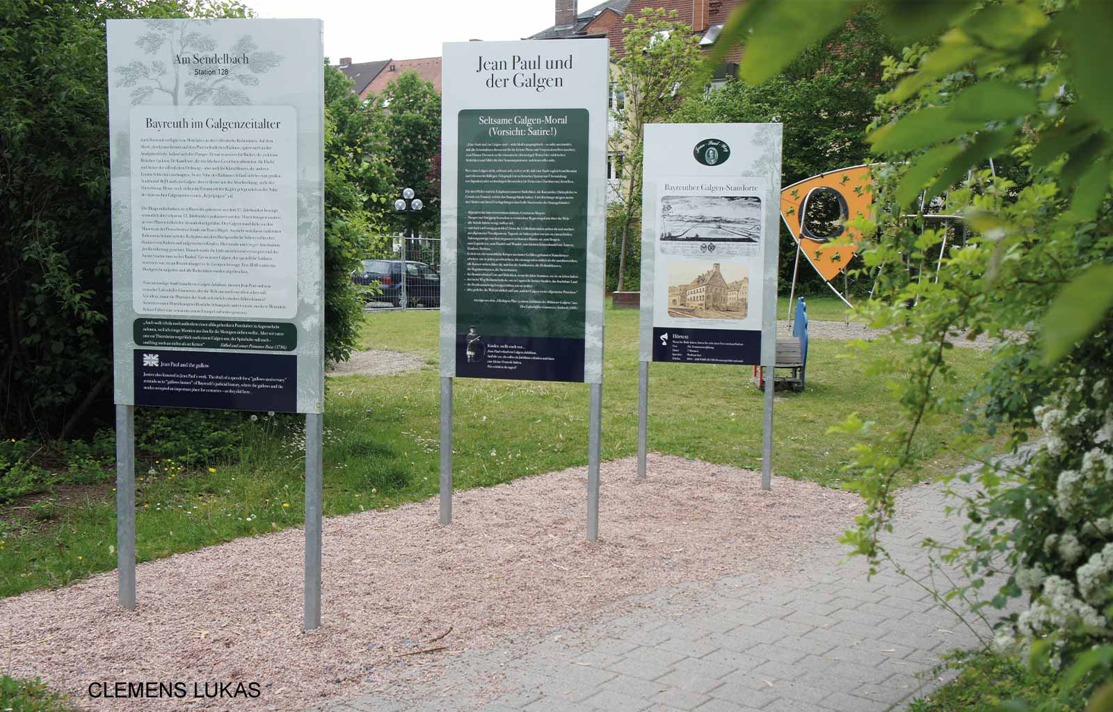Dass der Dichter sich beispielsweise tiefsinnige Gedanken zur Frage machte, welchen Sinn ein Denkmal habe, macht beim Jean-Paul-Denkmal (Station 121) natürlich einen eigenen Sinn. Wer in unmittelbarer Nähe zu den Schulen in Bayreuth und Eckersdorf (Stationen 116 & 135) erfährt, wie der Dichter seine eigene Schulzeit und die Existenz des Schulmeisterlein Wutz beschrieb, erhält einen poetischen Sachkundeunterricht, der die Schule von heute zwanglos mit der Schule von damals verbindet. Am Friedhof (Station 129) bietet sich ein Ausschnitt aus der berühmten Rede des toten Christus an.