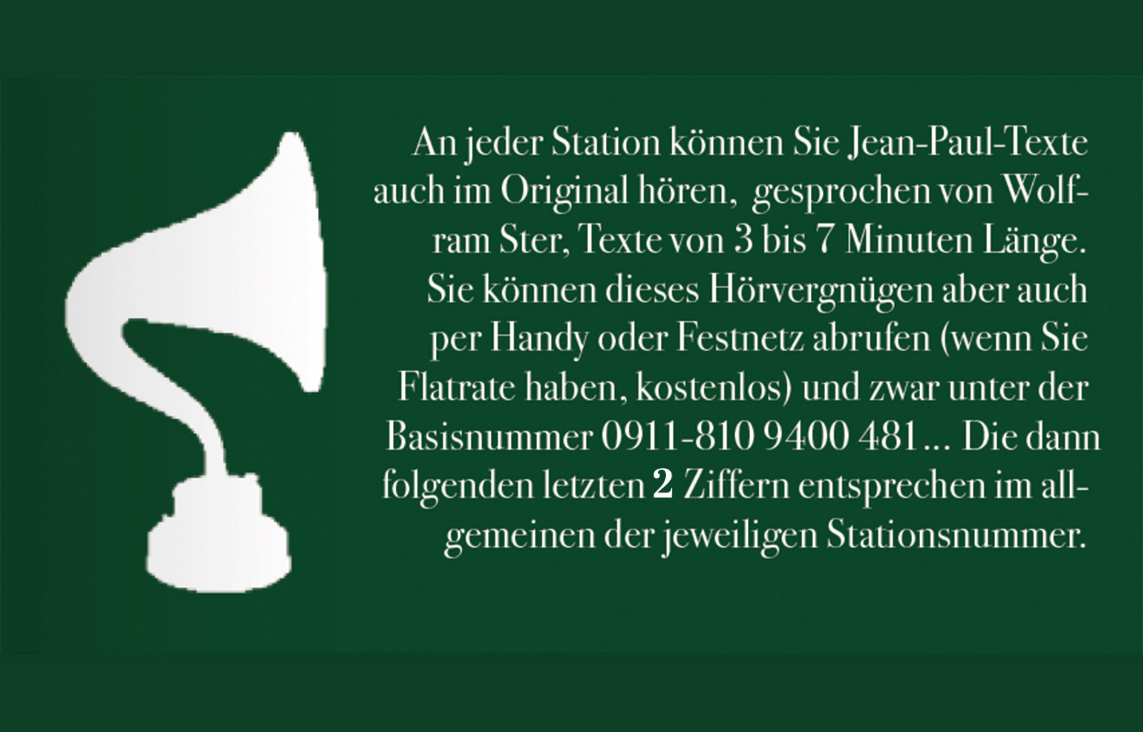 Wer sich die Groß-Stationen des Bayreuther Jean-Paul-Wegs von der Eremitage durch die Innenstadt bis zum Schlosspark Fantaisie und den Nachschweif zur Waldhütte bei Neustädtlein am Forst und zum Felsengarten Sanspareil (dem Endpunkt des Weges) erwandert – der hat die zusätzliche Gelegenheit, sich über Festnetztelefon (gratis) oder Handy (Gebühr) mit Jean Pauls Gedankenwelt vertraut zu machen.