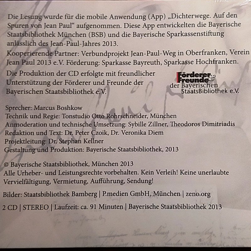 Für fortgeschrittene Jean-Paul-Kenner bieten sich anschließend die „Literaturverführer“-CDs im Verlag auricula an, die vom Schauspieler Hans-Jürgen Schatz zu des Dichters Ruhm und Ehre besprochen wurden. Er gehört ohnehin zu den Pionieren, die bundesweit und vor allem hier in der Region schon seit Jahren die jetzige Jean-Paul-Renaissance vorbereiten halfen (englert@auricula.de). Aber er ist nicht der einzige… Für eine größere Auswahl scrollen Sie einfach weiter!