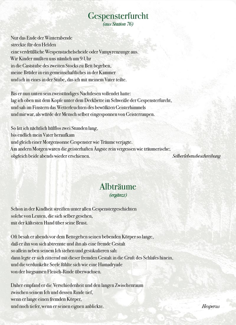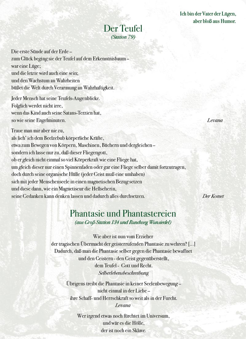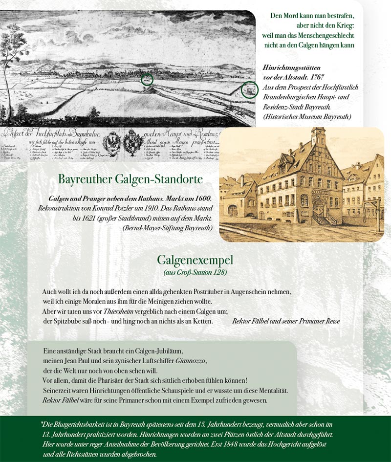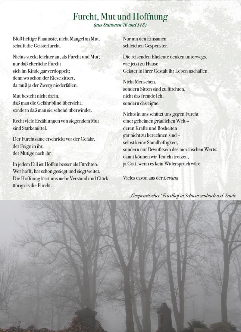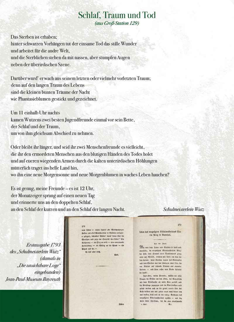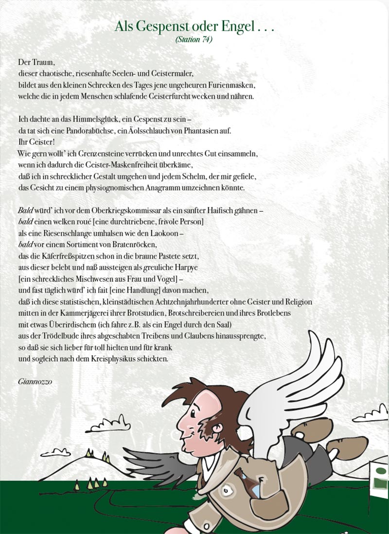 1807, also in seinem dritten Bayreuther Jahr, veröffentlichte Jean Paul einen seiner witzigsten Texte: Des Feldpredigers Schmelzle Reise nach Flätz. In dieser köstlichen Satire beschreibt der Dichter – der sich selbst als „Jean Pierre“ in die Geschichte einmontiert – eine Reise aus der Sicht eines Menschen, der sich vor allem und jedem fürchtet. Schmelzle ist ein Angsthase, wie er im Buche steht. Wir haben Ausschnitte aus dem Kapitel Dritte Station von Niederschöna nach Flätz ausgewählt (& eine Illustration von Stephan Klenner-Otto).