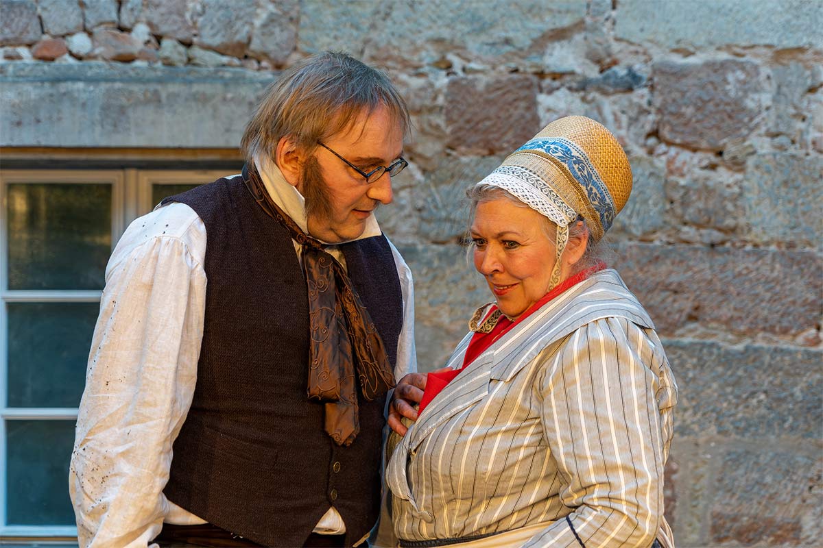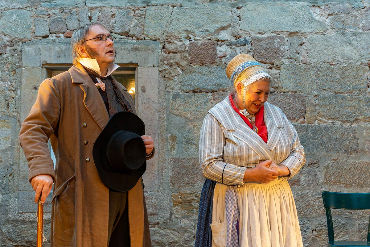 Der „einzigartige Jean Paul-Weg“ endet im Schlosspark Sanspareil. Ein passender Ort für das 2-Personen-Stück „Der Legationsrat, Jean Paul und die Rollwenzelin“, gespielt von Gordian Beck und Conny Trapper, beide Studiobühne Bayreuth.