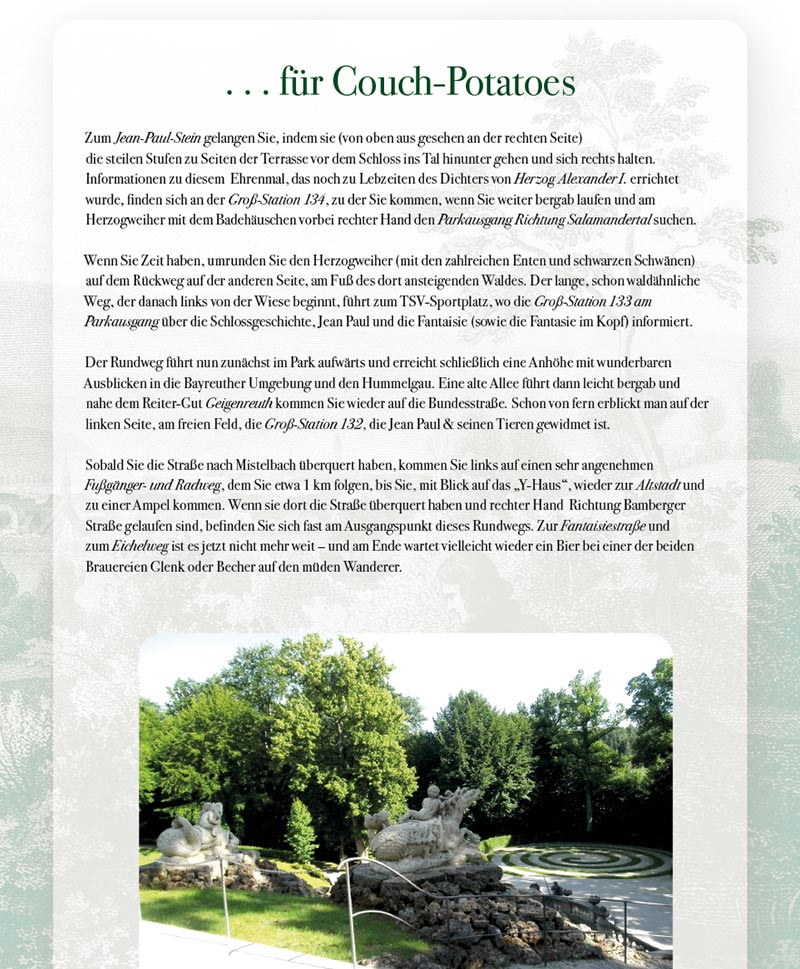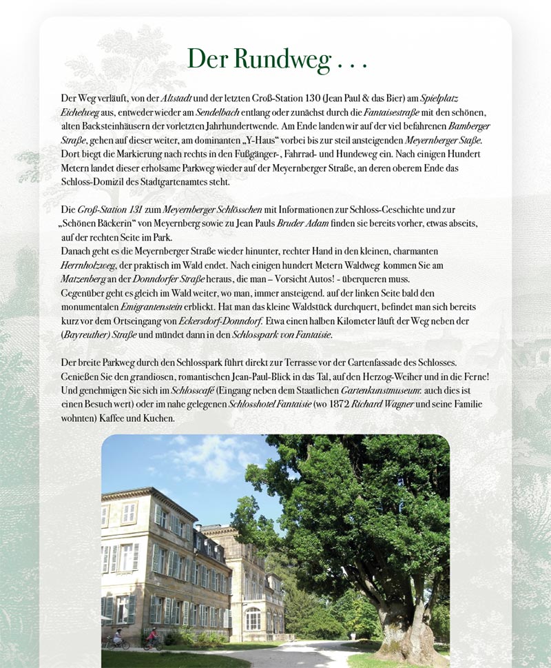 Die Groß-Station 13/ zum Meyemberger Schlösschen mit Informationen zur Schloss-Geschichte und zur „Schönen Backerin* von Meyernberg sowie zu Jean Pauls Bruder Adam finden sie bereits vorher, etwas abseits, auf der rechten Seite im Park.