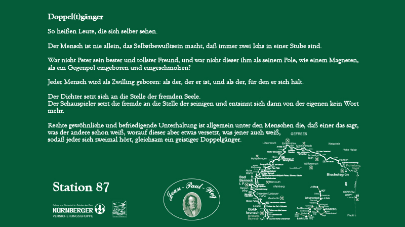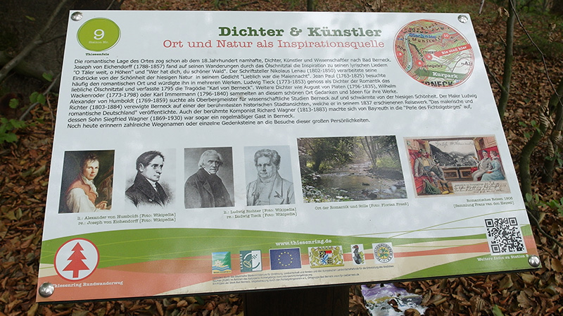 Der Online-Wanderführer Komoot bietet uns hier, neben schönen Fotos, eine Wander-Alternative auf der erhöhten Kolonnadenseite, nämlich über den Thiersenweg (Höhenweg ohne Jean Paul-Tafeln). Dadurch wird der Rundweg ca. 2km länger.