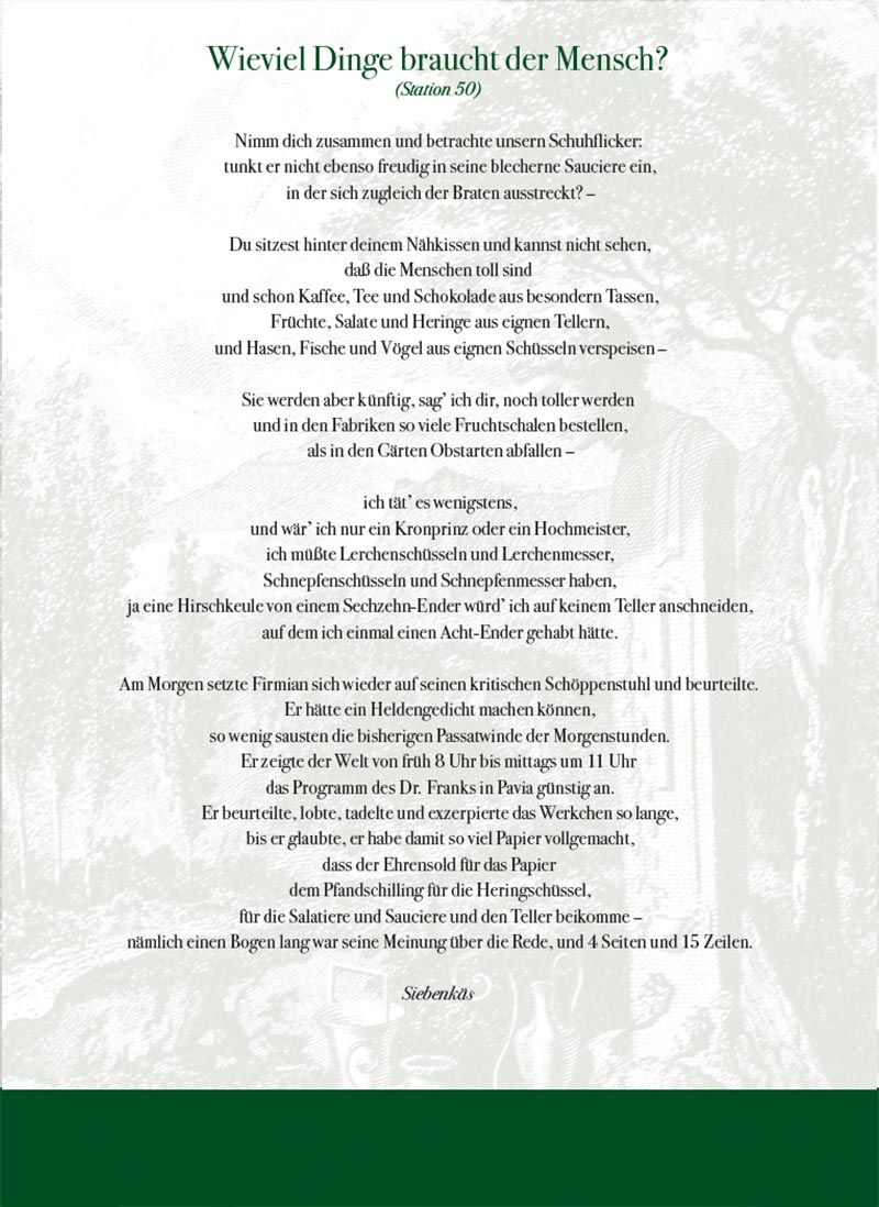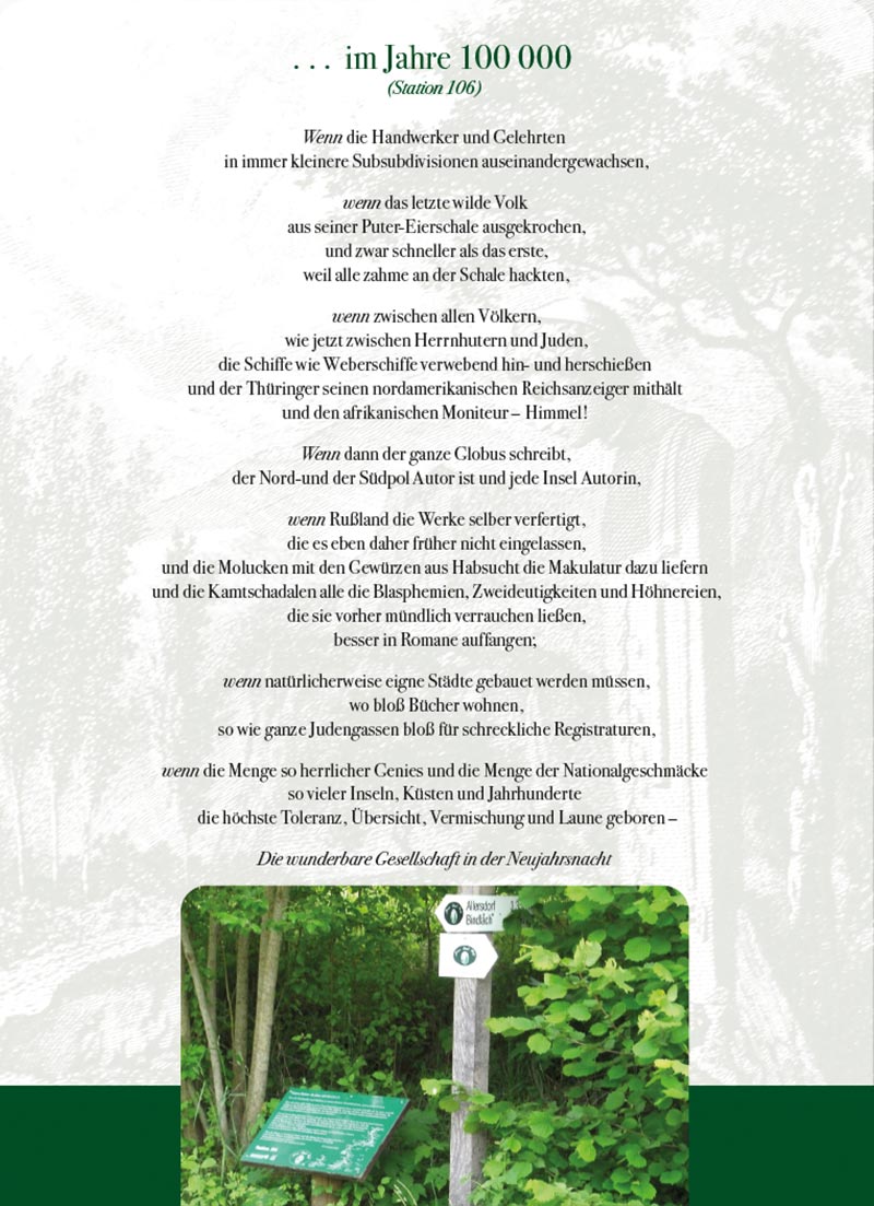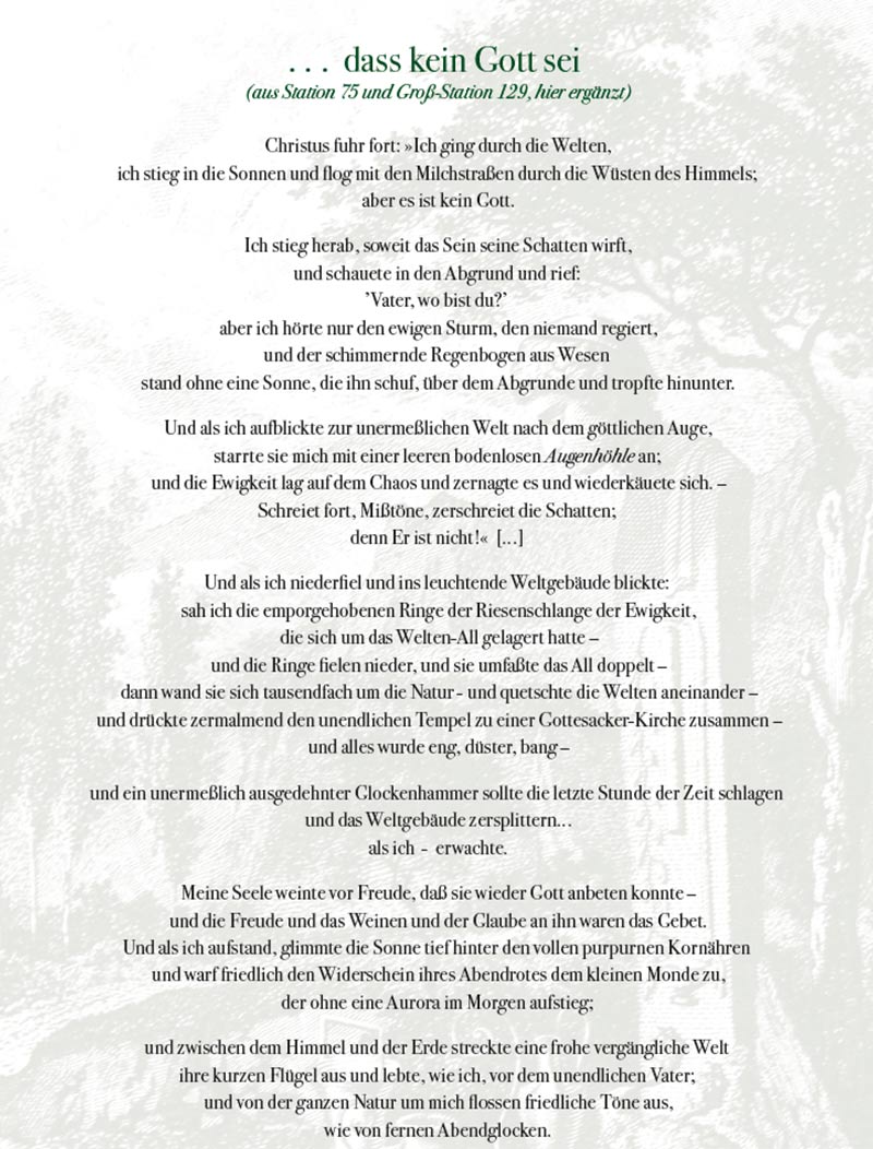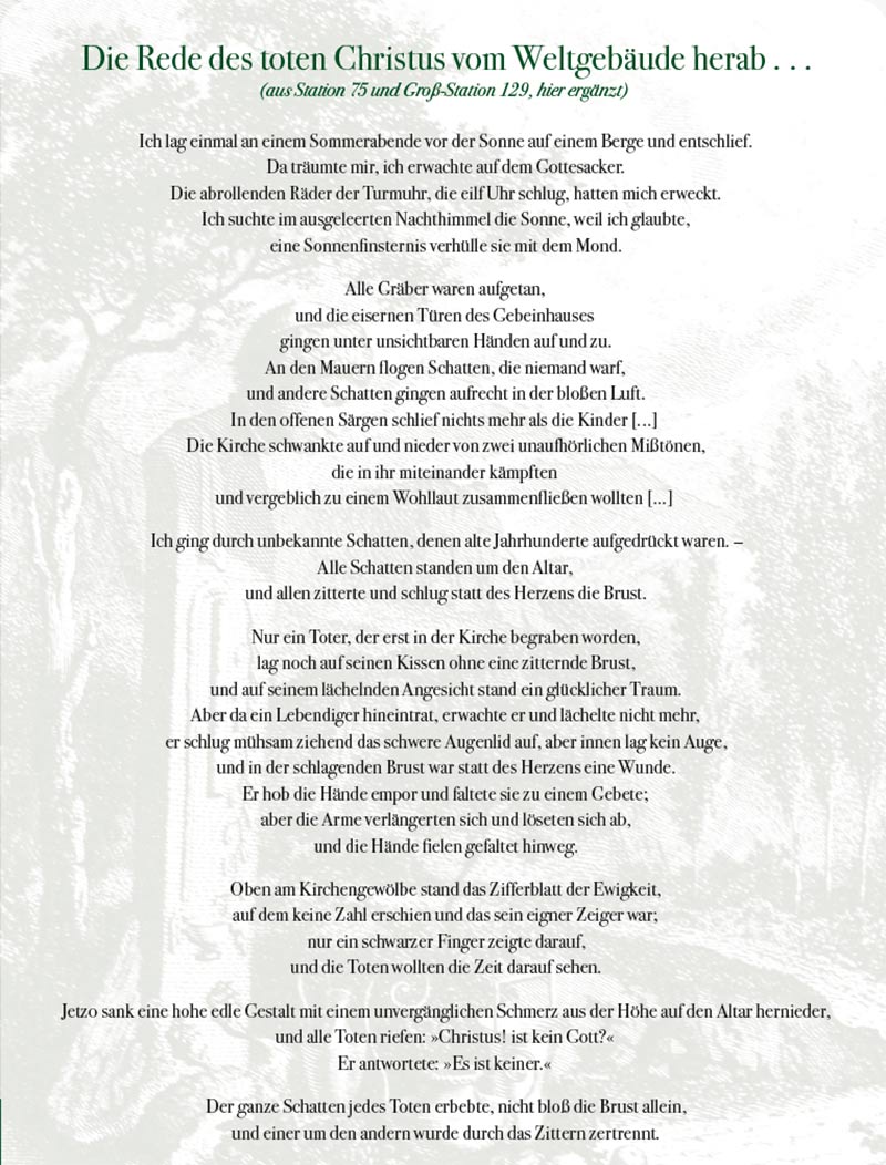 Die Rede des toten Christus vom Weltgebäude herab, daß kein Gott sei – dies ist der berühmteste Text, den Jean Paul je verfasst hat. Er entstand bereits 1789 unter dem Titel Shakespeares Klage unter den toten Zuhörern in der Kirche, daß kein Gott sei. 1796 veränderte er den Titel und fügte den Text als Erstes Blumenstück in den Roman Siebenkäs ein. Der Albtraum eines gottlosen Alls gehört mit seinen apokalyptischen Bildern zum Stärksten, was die Literatur des 18. Jahrhunderts zu bieten hat.