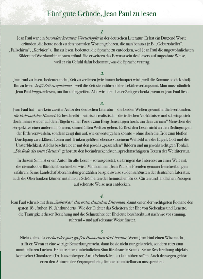 Jean Paul gehört zu den Größten der deutschen Literatur. Als Sprachmagier und Spracherfinder ohnegleichen gerühmt, ist er in vielerlei Hinsicht:
