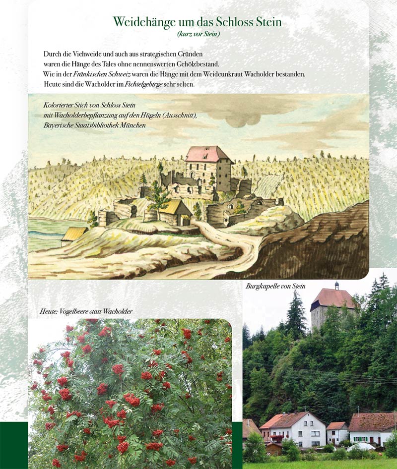 Nach der Mühle queren wir zum ersten Mal die Ölschnitz, ein 18,5 km langer, rechter Nebenfluss des Weißen Mains, steigen kurz das Sträßlein hoch und zweigen dann links in den Talgrund ab. Im Ölschnitztal kann man nicht fehlgehen, mal im Wiesengrund, mal etwas nach oben versetzt, begleitet uns stets das Plätschern des Flusses. Nach der Station 84 – Garten des Lebens treffen wir auf die nach Stein führende Straße, vor uns auf der Anhöhe die Burgkapelle.