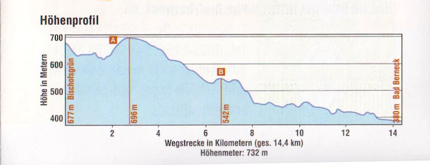 Dort vorsichtig hinüber und gleich halblinks schnurgerade in den Wald hinein (Schweinsbach: 1, 7 km). Gut gekennzeichnet weisen die auffallenden Wegezeichen des Jean-Paul-Weges bei zwei Gabelungen nach rechts, bevor es dann nach einem Linksbogen etwas steiler, dann über einen breiten Privatweg allmählich – immer noch abwärts – aus dem Wald hinausgeht. Das 609 m auf einer Waldwiese hoch gelegene Schweinsbach liegt vor uns.