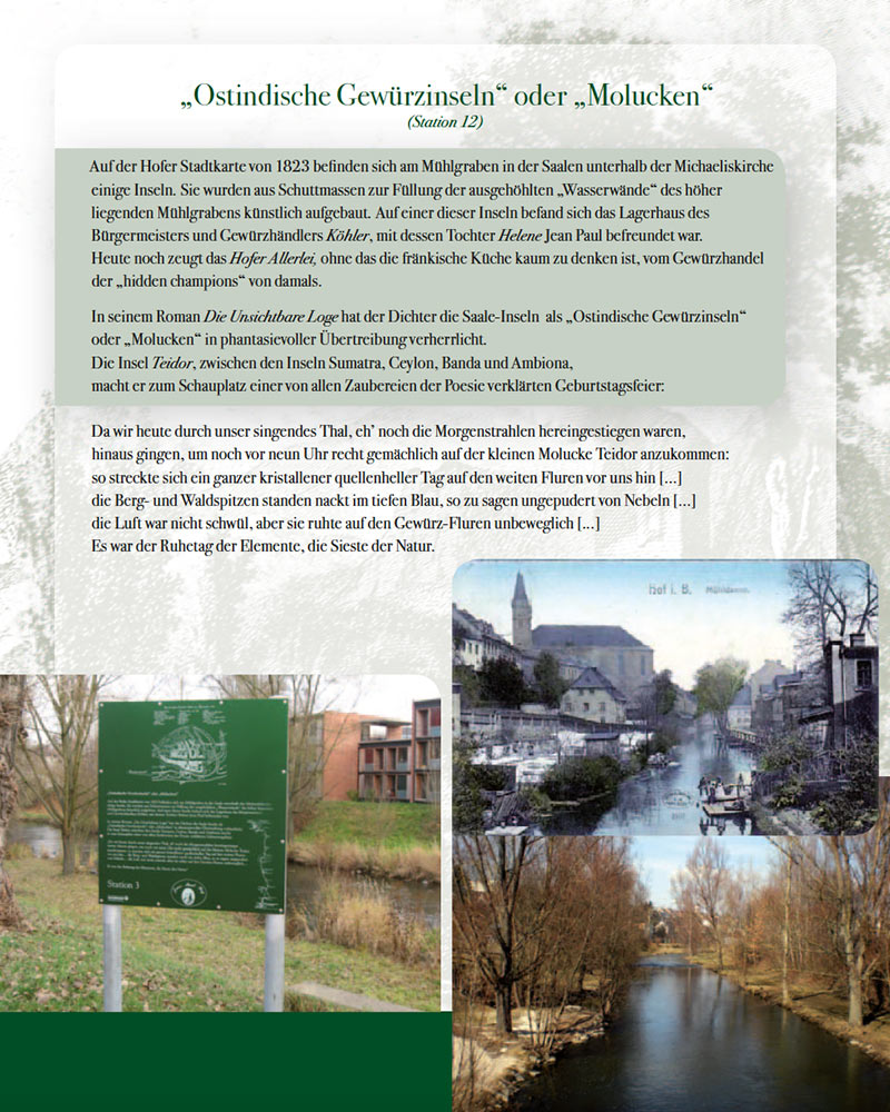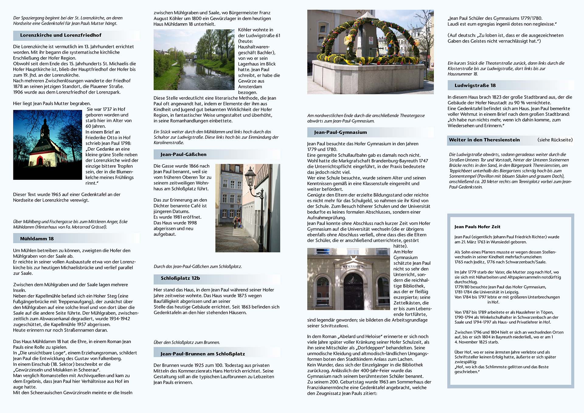 Der Rundgang durch Hof führt an zahlreichen Plätzen und Stätten vorüber, die mit dem Dichter verbunden sind. So erinnern die Lorenzkirche und der Lorenzfriedhof, Mühldamm 18, Jean Paul-Gässchen, Schlossplatz 12 b, Jean Paul-Brunnen am Schlossplatz, Jean Paul Gymnasium und der Jean Paul-Gedenkstein im Stadtpark Theresienstein an den Dichter, der über Hof schrieb: „Besehet Hof, wo ich das Meiste gelitten, aber das Beste geschrieben.“ Wer erfahren will, was es mit den „ostindischen Gewürzinseln oder Molukken“ auf sich hat, ist zur Stadtführung eingeladen.