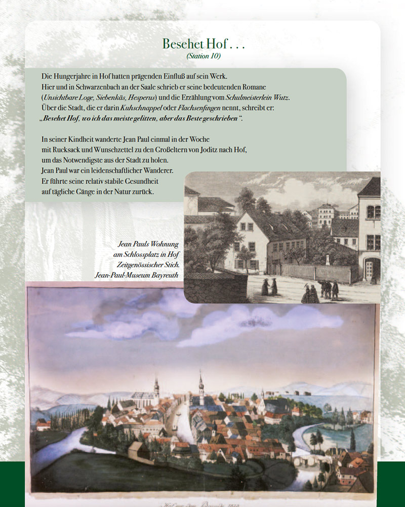 In Hof besuchte Jean Paul das Gymnasium, das heute nach ihm benannt ist, und er kehrte in den frühen Jahren immer wieder in die Stadt an der Saale zurück. Unter „Kuhschnappel“ oder „Flachsenfingen“ taucht Hof in seinen Werken auf. Hier und in Schwarzenbach an der Saale entstehen seine wohl bedeutendsten Romane, wie der „Hesperus“, mit dem ihm der literarische Durchbruch gelang, „Die unsichtbare Loge“, „Leben des vergnügten Schulmeisterlein Maria Wutz in Auenthal“ oder der „Siebenkäs“.