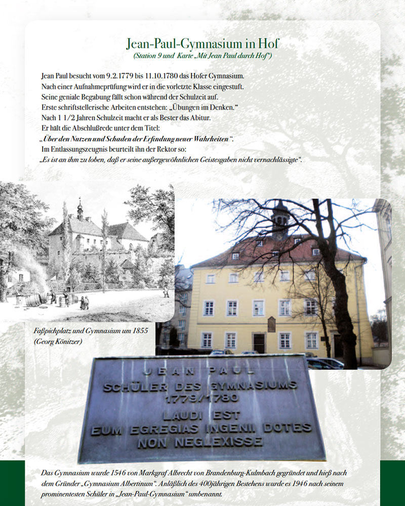 Jean Paul an. „Herz und Verstand mitnehmen“, heißt es. . . , denn zwiespältig sind des Dichters Erinnerungen an die „Hungerjahre“ in Hof, und das wird bei der Stadtführung auch nicht verschwiegen: Wohl hat er hier „das Beste geschrieben . . .“, angefangen mit seinem 1790 prämierten Abitursaufsatz „Über den Nutzen und Schaden der Erfindung neuer Wahrheiten“ am hiesigen (Jean Paul) Gymnasium. Da war Jean Paul 17 Jahre alt. Auch das Geheimnis der „Erotischen Akademie“ wird gelüftet.