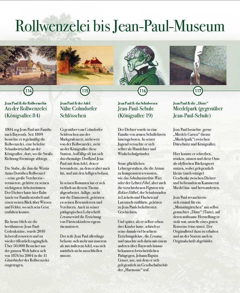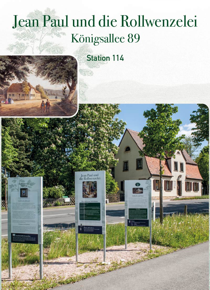 Vor der Rollwenzelei, in der die Dichterstube samt Museumsraum zu besichtigen sind, fasst die erste Groß-Station auf dem Jean Paul-Weg auf drei Stelen die Bedeutung dieses Zufluchtsortes für den Dichter während seiner Bayreuther Zeit anschaulich zusammen.