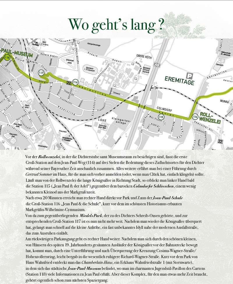 Nach etwa 20 Minuten auf der Königsallee erreicht man rechter Hand (nach der großen Ampel), direkt vor Park und Zaun der Jean Paul Schule die Groß-Station 116 Jean Paul & die Schule, kurz vor dem im schönsten Historismus erbauten Markgräfin Wilhelmine Gymnasium mit seinem Park.