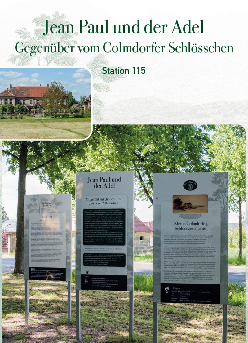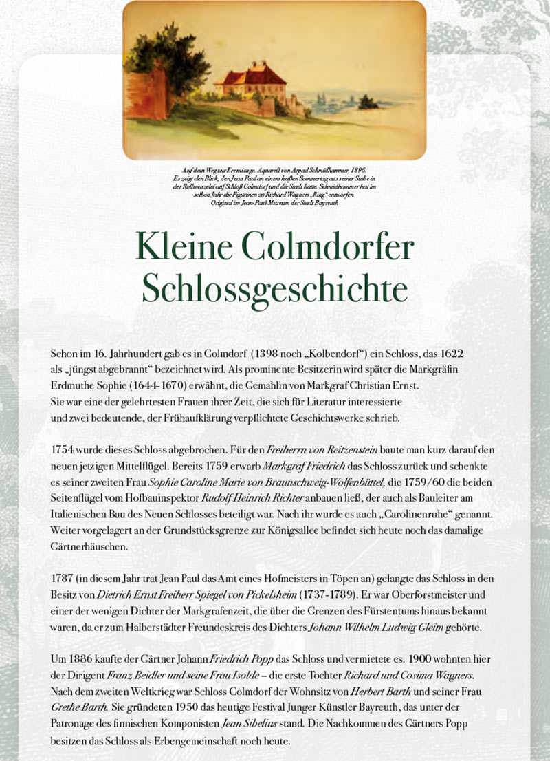Läuft man von der Rollwenzelei die lange Königsallee in Richtung Stadt, so erblickt man linker Hand bald die Station 115 („Jean Paul & der Adel“) gegenüber dem barocken Colmdorfer Schlösschen, einem bisher noch wenig bekannten Kleinod aus der Markgrafenzeit. Seit der privaten Restaurierung durch die Familie Rothenbücher ist es eine touristische Attraktion für gemütliche Einkehr (auch mit Hunden), gesellschaftliche Events & Feste sowie Schloss-Führungen.